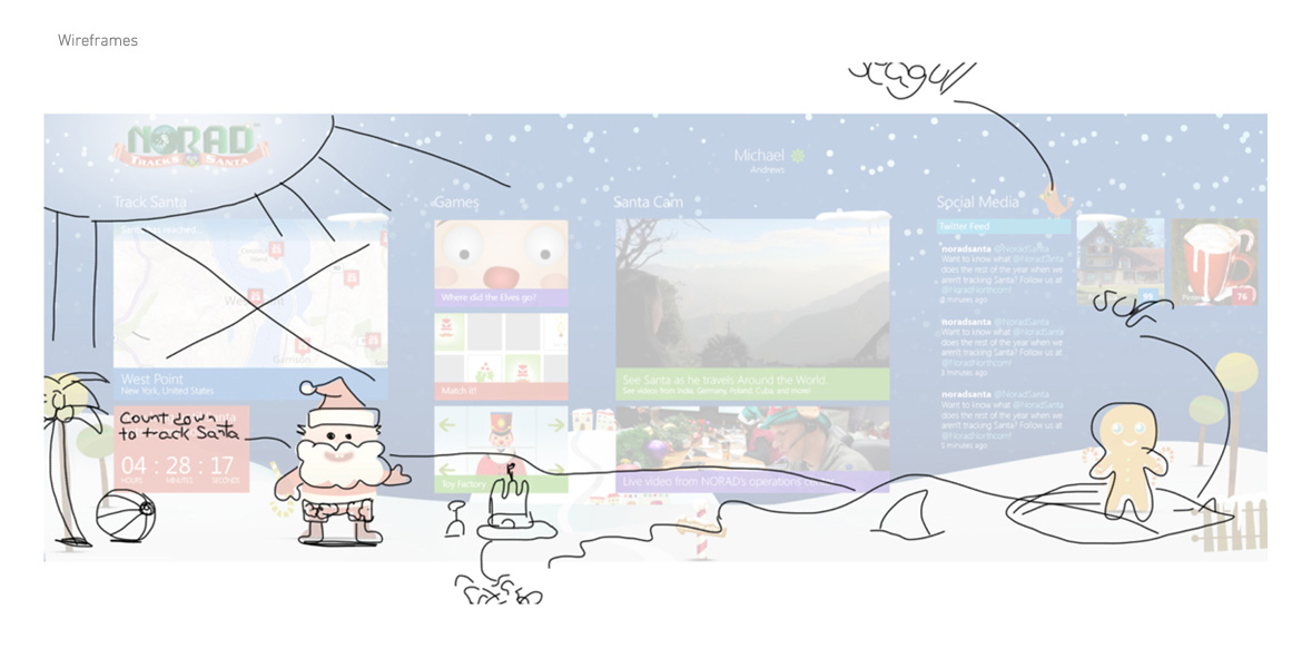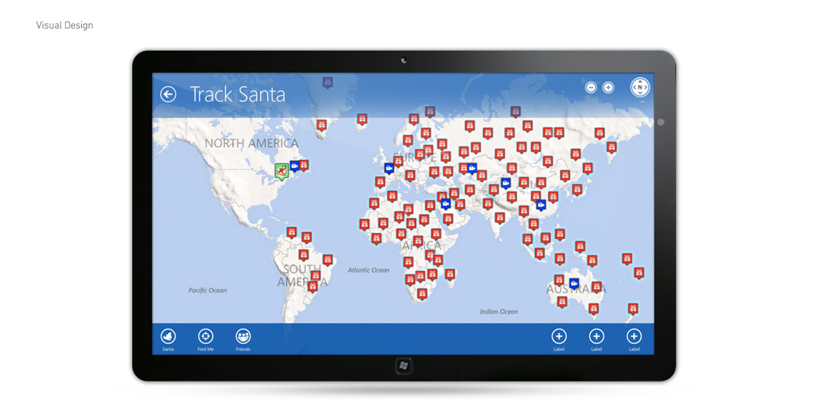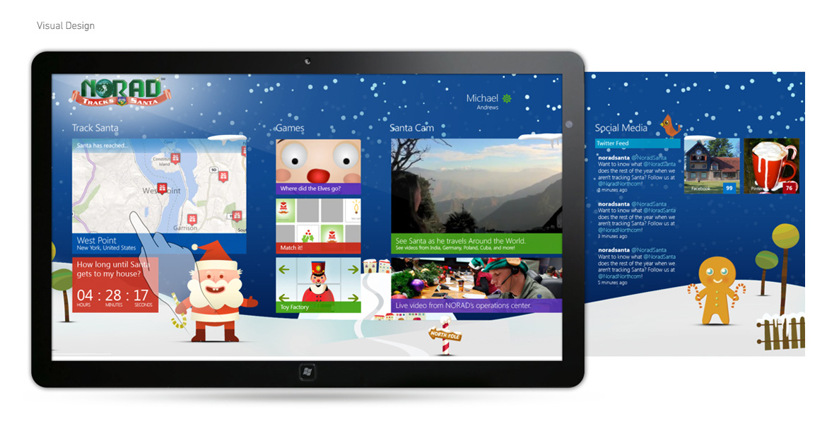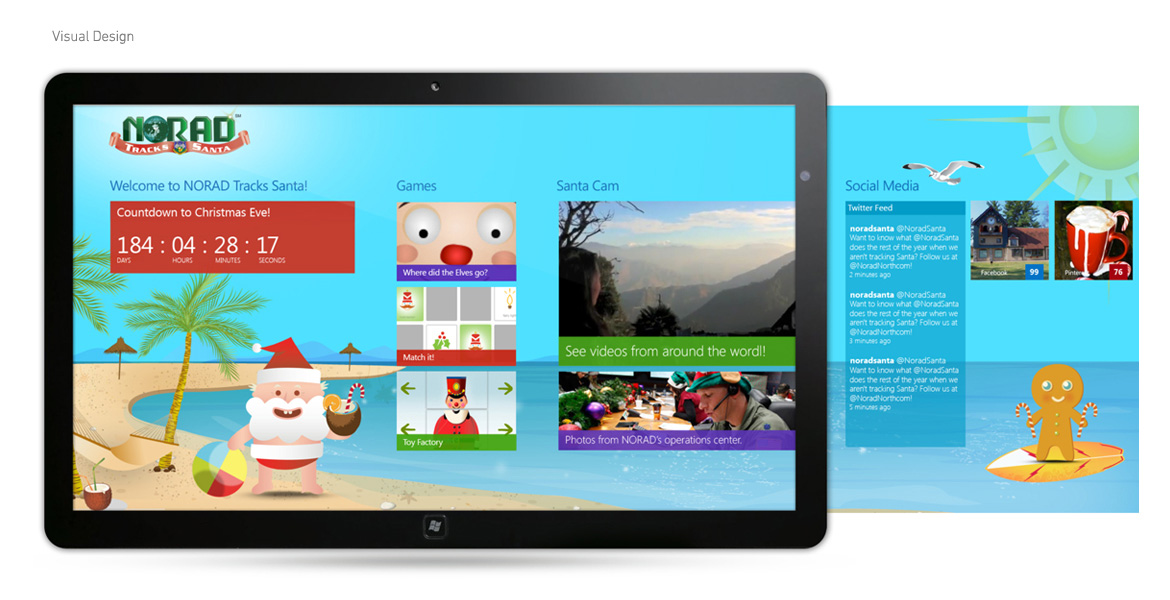 As part of NORAD's website redesign goals for 2012, they also needed a user experience to be tied to the official release. I worked as the lead user experience designer on the Windows 8 application that included a countdown to Christmas Eve, map tracker, and a series of interactive games and activities.