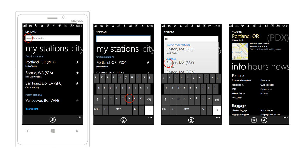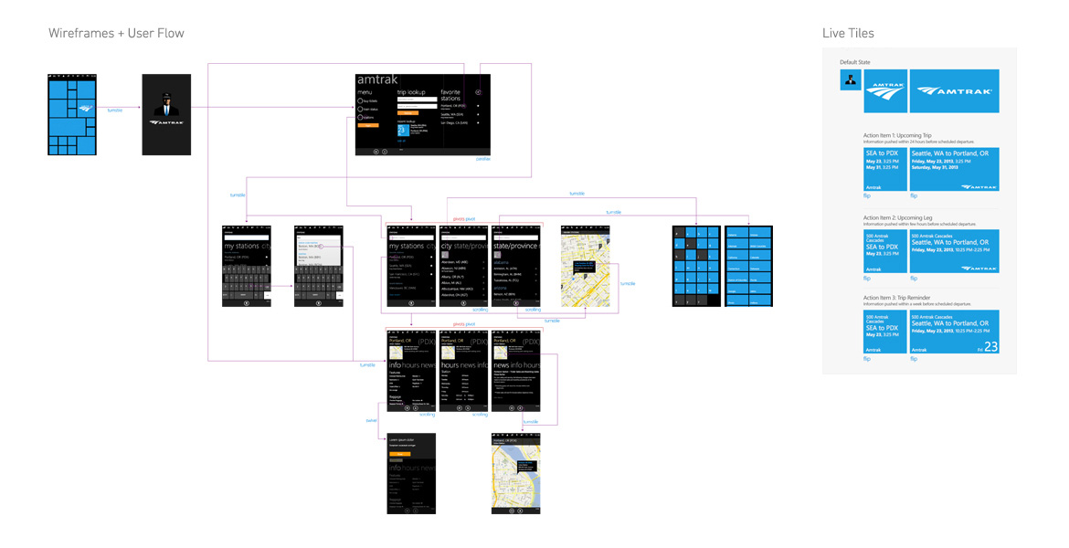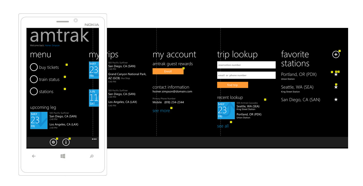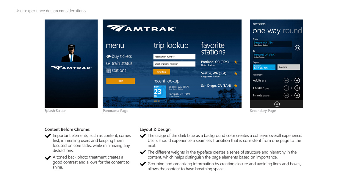 I was responsible for leading the experience of key pages and components for Amtrak's Windows Phone 8 app.