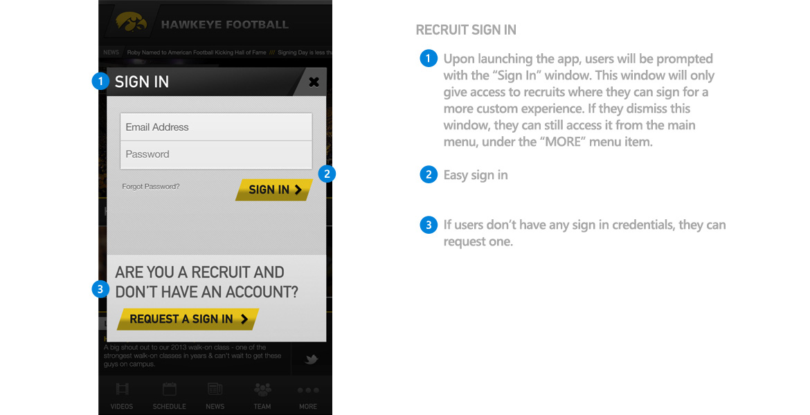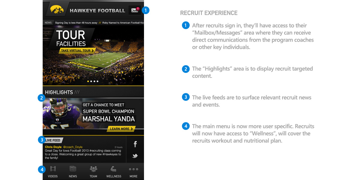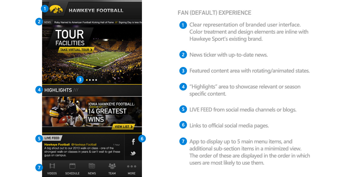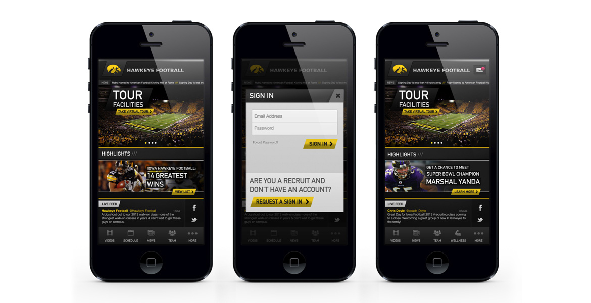 The University of Iowa Department of Intercollegiate Athletics was seeking an app experience for its football program. The audience consisted of fans and recruits, and the app's content served both user types. Features included a news ticker, blog feeds, roster, photo and video galleries, and premium content for recruits where they could log in to access personalized content.