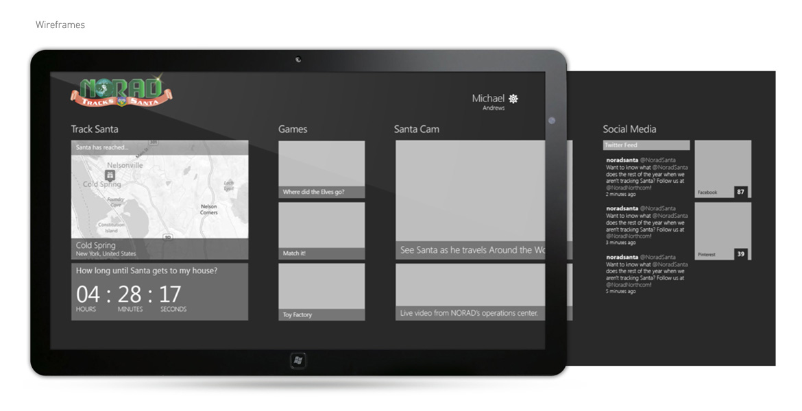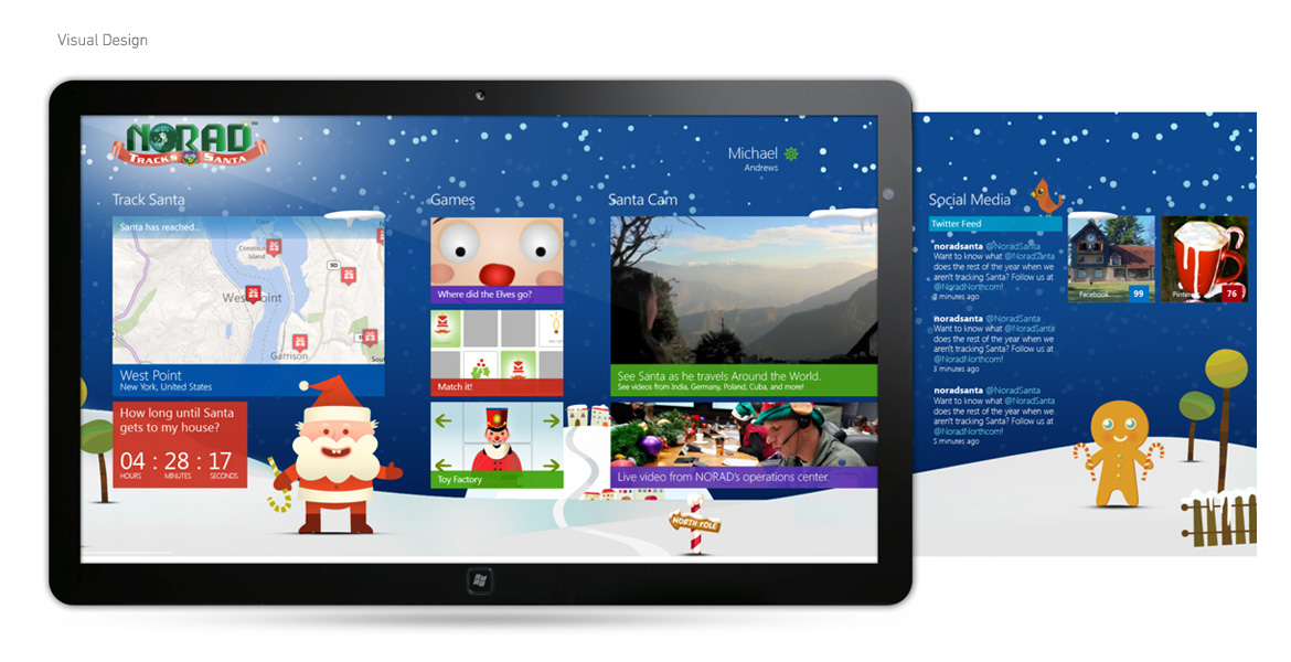 As part of NORAD's website redesign goals for 2012, they also needed a user experience to be tied to the official release. I worked as the lead user experience designer on the Windows 8 application that included a countdown to Christmas Eve, map tracker, and a series of interactive games and activities.